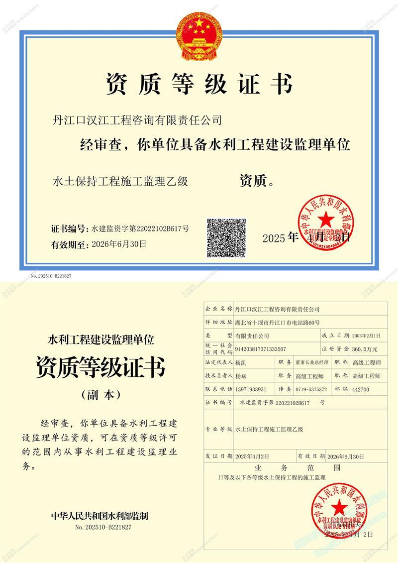 (原漢江綜合開發公司水利水電監理中心)成立于 1989年3月,1993年6月經水利部審批成為首批注冊監理單位 (隸屬于長江水利委員會), 注冊資本 360萬元 。公司位于湖北省十堰市丹江口市電站路。公司目前擁有水利部頒發的 水利工程施工監理甲級 、 水土保持工程施工監理 乙 級 資質 ;住建部頒發的 房屋建筑 、 市政公用工程監理 乙 級資質 。 可獨立承擔 各類水利水電工程 、 一般工業與民用建筑工程監理 , 土地整治 , 招標代理 、 技術咨詢 等業務。公司實行董事會領導下的總經理負責制,下設辦公室、經營部、財務部、工程技術部等職能部門。……